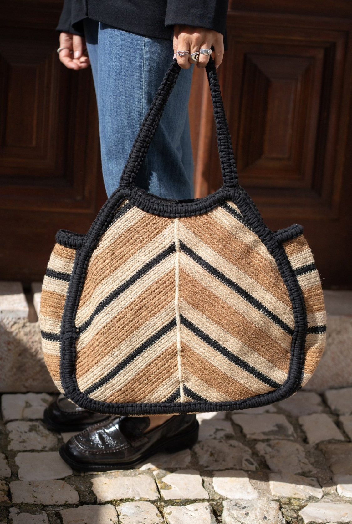 bolsa de ráfia com um padrão em espinha de peixe e é especial por causa da sua coloração. Vai ser difícil escolher entre as duas cores disponíveis ;)